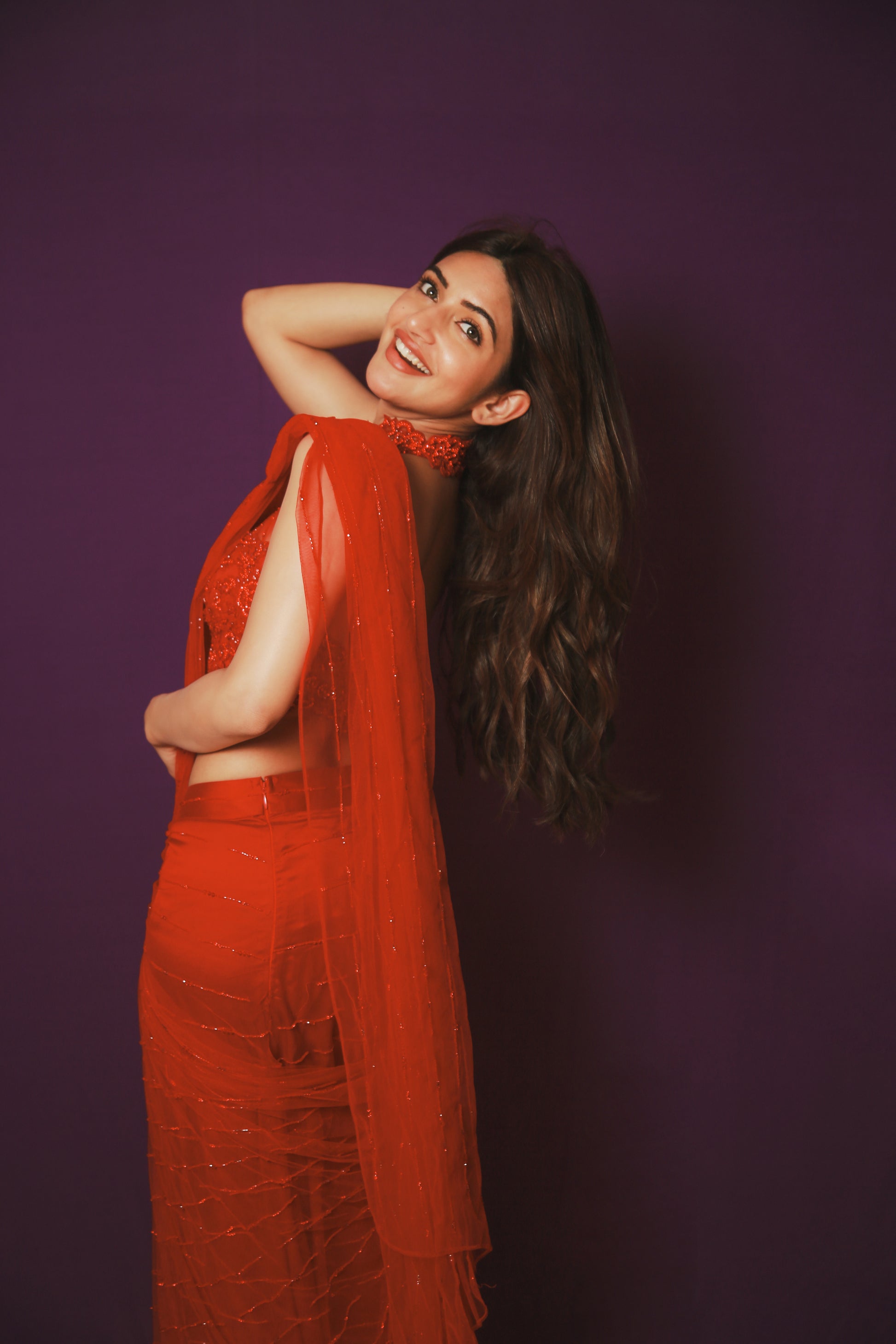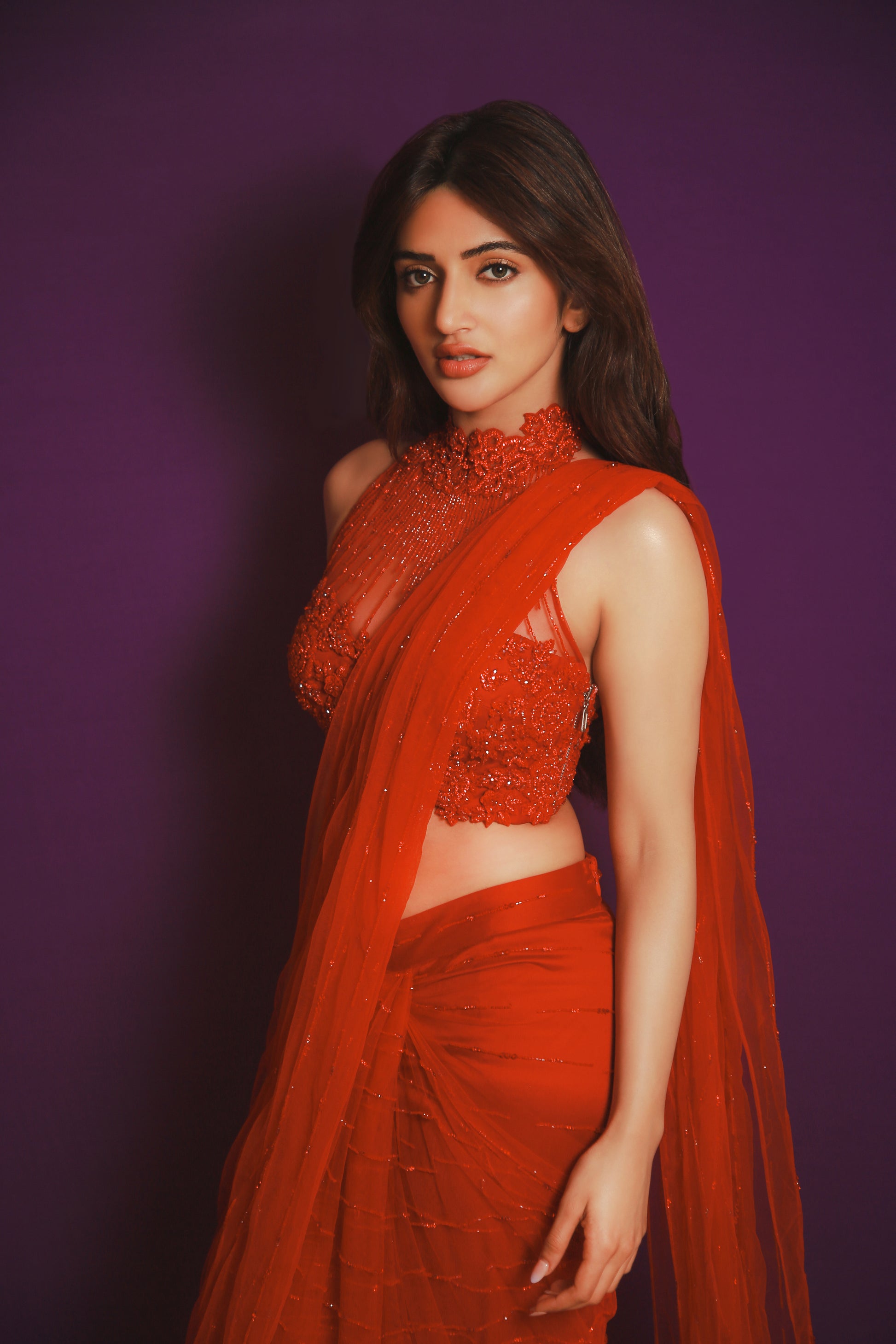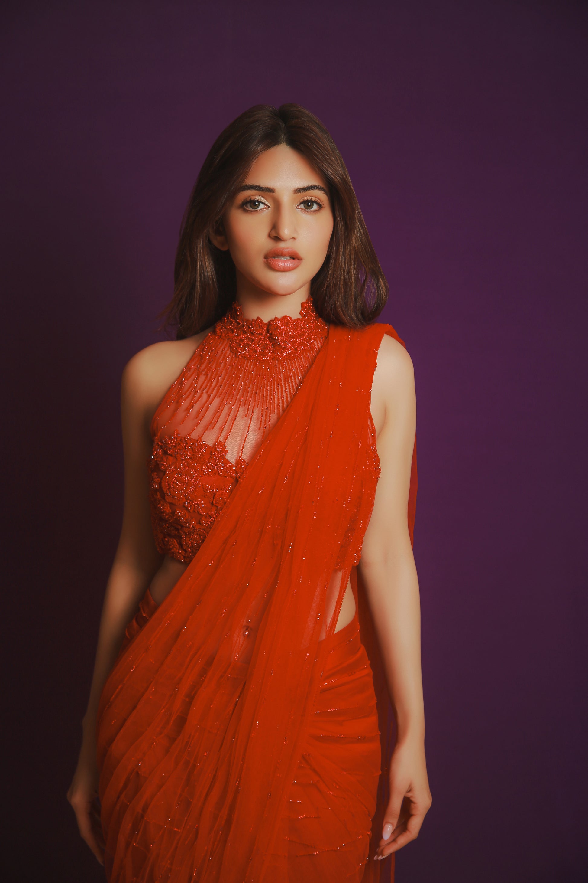 Draped in delicate tulle net fabric, the sari flows with lightness and grace, creating a modern yet timeless silhouette. The blouse is designed with exquisite floral embroidery and crystal beadwork, enhancing its rich texture and giving it a couture appeal.